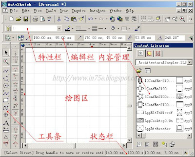 启动AutoSketch,界面上除了标准的菜单栏和工具条外,围绕绘图还展开布置了多项工具。